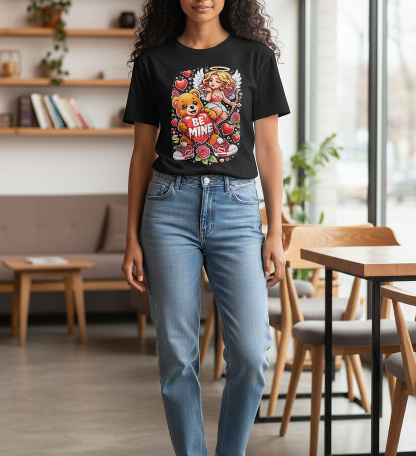 The playful “Be Mine” design blends cute and romantic elements, making it perfect for Valentine’s Day dates, gifts, or casual seasonal outfits. Printed on a classic black tee, the vibrant artwork stands out beautifully while maintaining a clean, professional look.