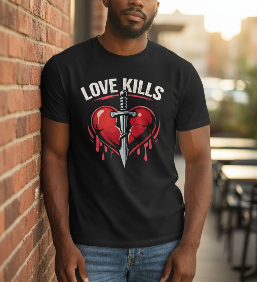 Make a bold statement this Valentine’s Day with the Love Kills Ultra Cotton Tee. Designed for those who embrace love with an edge, this striking graphic features a cracked, bleeding heart pierced by a dagger—perfectly capturing passion, heartbreak, and intensity in one unforgettable design.
